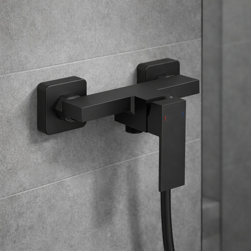 Сучасний настінний змішувач для ванної кімнати поєднує стильний мінімалістичний дизайн і надійну функціональність. Лаконічні геометричні форми та чорне матове покриття роблять модель ідеальним вибором для сучасних інтер'єрів у стилі лофт, мінімалізм чи ганьби-тік.