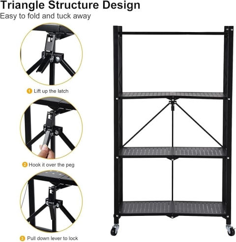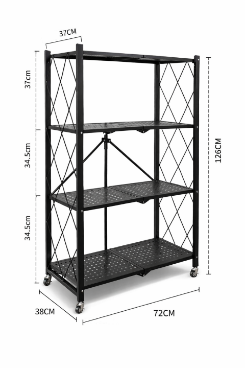 Складаний стелаж оснащений чотирма пластиковими колесами з металевою основою, які дозволяють легко переміщати його. Також два колеса мають функцію блокування, що дозволяє надійно зафіксувати стелаж у вибраному положенні.