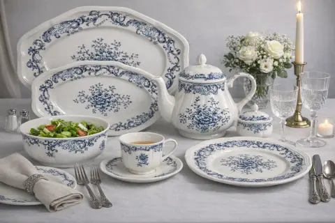 Столовий сервіз DY01 – це витончене поєднання елегантності, якості та практичності. Ніжна біла порцеляна з блакитним орнаментом створює відчуття свіжості, легкості та бездоганного смаку. Візерунок нагадує тонке мереживо, надаючи сервіруванню особливий шарм і романтичний настрій.