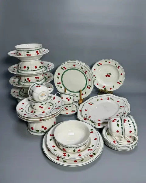 Столовий сервіз RG 1119 — це поєднання класики та затишної естетики. Чистий білий фарфор прикрашений ніжним малюнком стиглих вишень і акуратною зеленою окантовкою, що надає сервізу свіжості та природного шарму. Плавні форми посуду й делікатний декор створюють легкий, теплий настрій, ідеальний як для щоденного використання, так і для красивої святкової сервіровки.