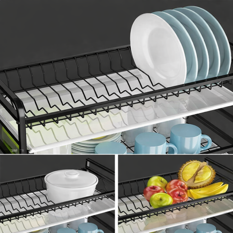 Органайзер для миття посуду R2F-43см - виготовлений з високоякісного металу з порошковим покриттям. Він стійкий до пошкоджень та вологи, що утворюється при зберіганні мокрого посуду. Стабільна конструкція дозволяє розміщувати на органайзер навіть важкі предмети.