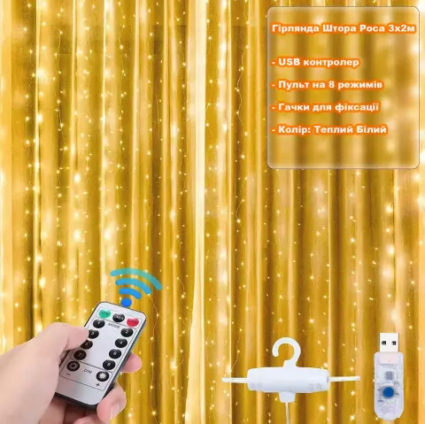 Світлодіодна гірлянда штора роса на дроті 3х2 м 200 LED пульт + USB теплий білий