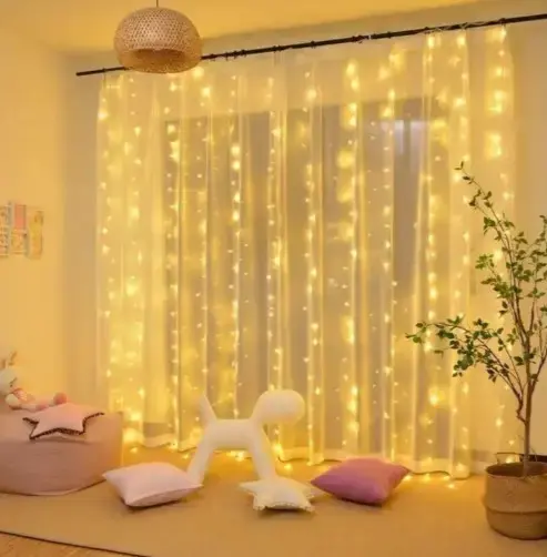 Світлодіодна гірлянда штора призначена для оформлення офісів, квартир, ресторанів, кафе та декору фотозон. Прикраса складається з силіконових проводів та світлодіодних лампочок, від горизонтального шлейфу відходять нитки з діодами.