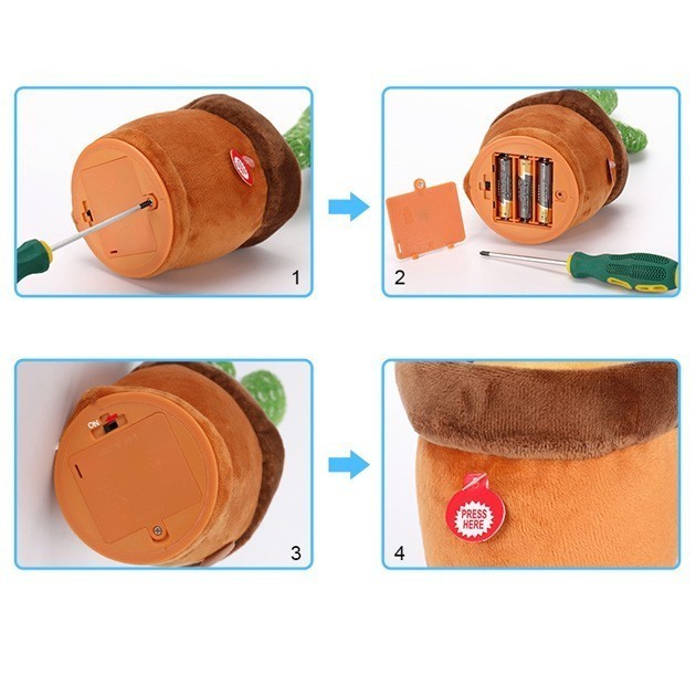 Записуючий пристрій у кактусі запише будь-яку вашу пропозицію, яку Ви вимовите поруч з кактусом, що танцює, і через 1-2 секунди він повторить ваші слова дуже смішним голосом і витонченим танцем!