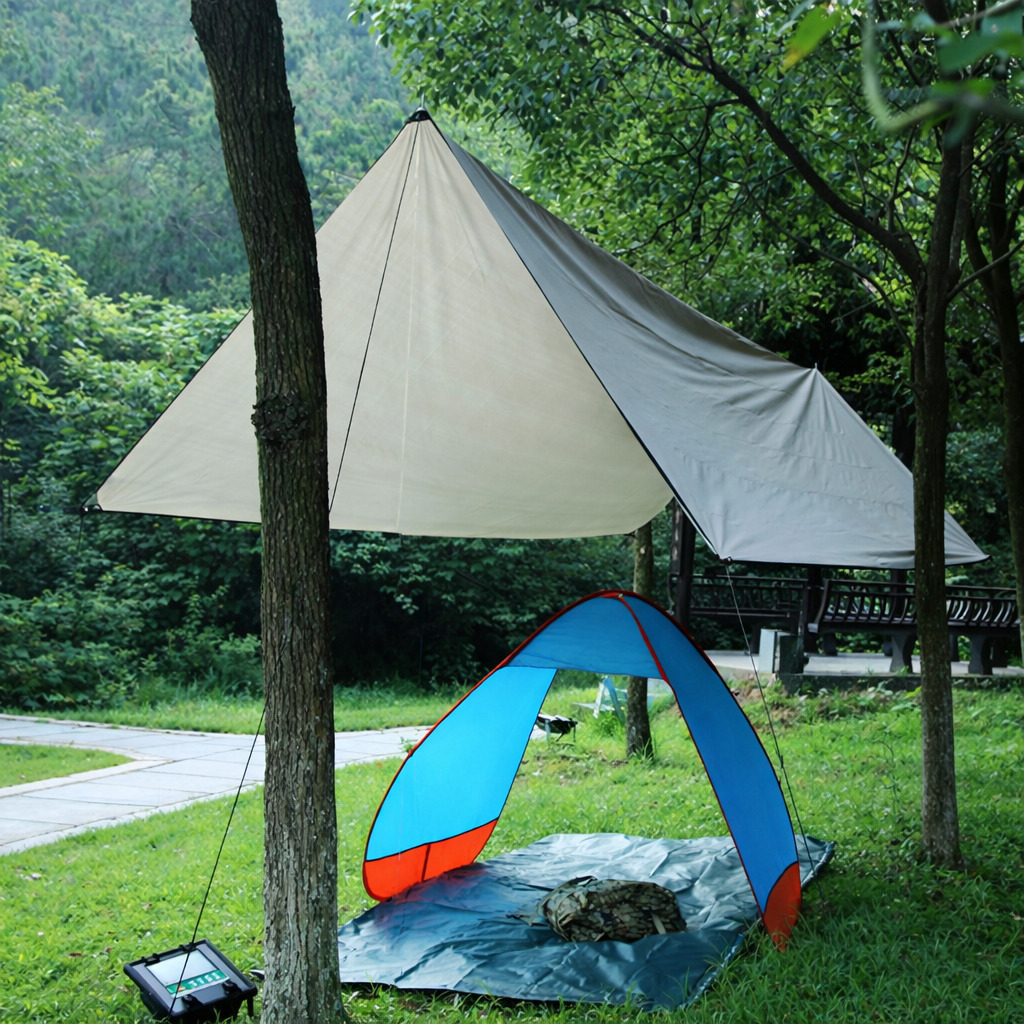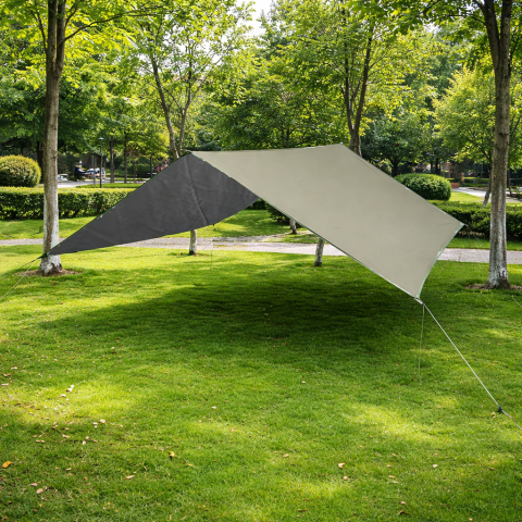 Водонепроникний тент від намету можна використовувати як багатоцільове укриття для задоволення потреб під час активного відпочинку на природі. Ви можете розстелити його на підлозі як килимок для пікніка або використовувати вітрозахисну мотузку та кілочки для гнучкої установки укриття, навісу, дощового тенту або гамака, що ідеально підходить для кемпінгу, походів, піших прогулянок, риболовлі, пікніків, садівництва, пляжного відпочинку і т.д.