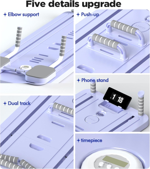 Цей тренажер призначений для зміцнення м'язів кори та реабілітації. Він оснащений регульованими еластичними стрічками опору, вбудованим таймером та м'яким наколінником, підходить для всіх рівнів підготовки та знижує навантаження на суглоби. Ручка для перенесення забезпечує зручне транспортування та зберігання, дозволяючи тренуватися у будь-який час та в будь-якому місці.