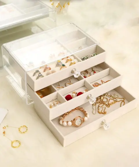 Скринька-органайзер для прикрас з трьома висувними ящиками призначена для акуратного зберігання кілець, сережок, браслетів, годинників та інших аксесуарів. Внутрішня організація включає роли для кілець, маленькі осередки для маленьких прикрас та просторий відсік для величезних виробів. Прозора кришка захищає вміст від пилу та дозволяє бачити всі прикраси без необхідності відкривати органайзер.