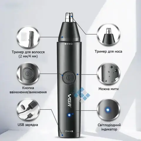 Тример VGR V613 універсальний 2 в 1 для носа вух та окантування з USB зарядкою вологозахистом