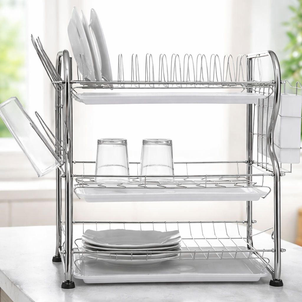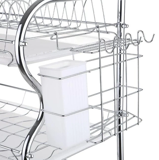 Цей зручний сушарка-органайзер надає три рівні для сушіння посуду, приладів, чашок та іншого кухонного приладдя. Виготовлена ​​із міцної нержавіючої сталі, вона забезпечує надійне та довговічне використання.