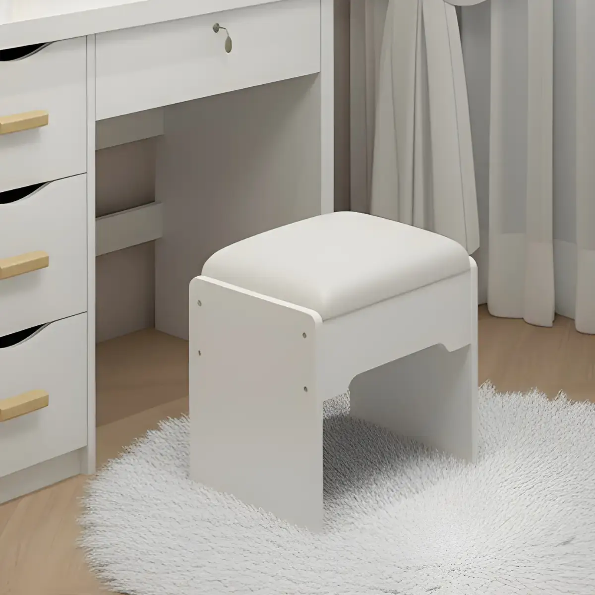 Конструкція виконана в сучасному стилі та універсальному білому кольорі, що легко вписується в будь-який інтер'єр. Ергономічний пуф забезпечує зручність при тривалому використанні, а міцні матеріали гарантують довговічність. Такий комплект підходить як для дому, так і для салону краси, створюючи акуратну та стильну зону догляду.