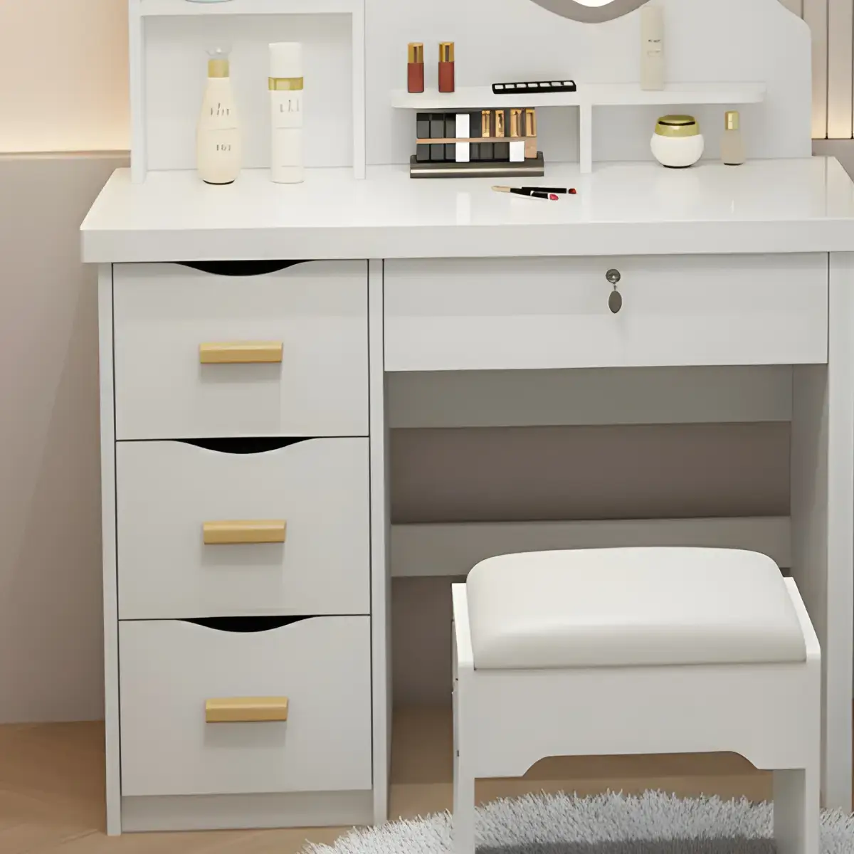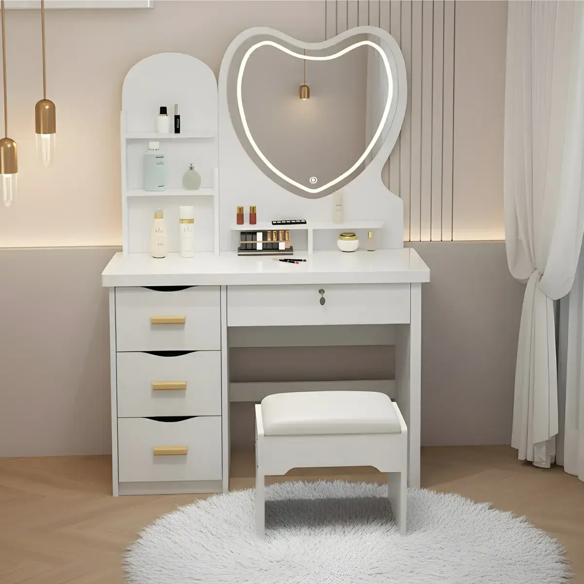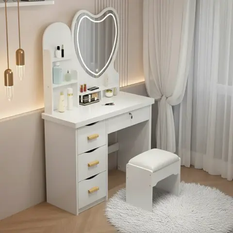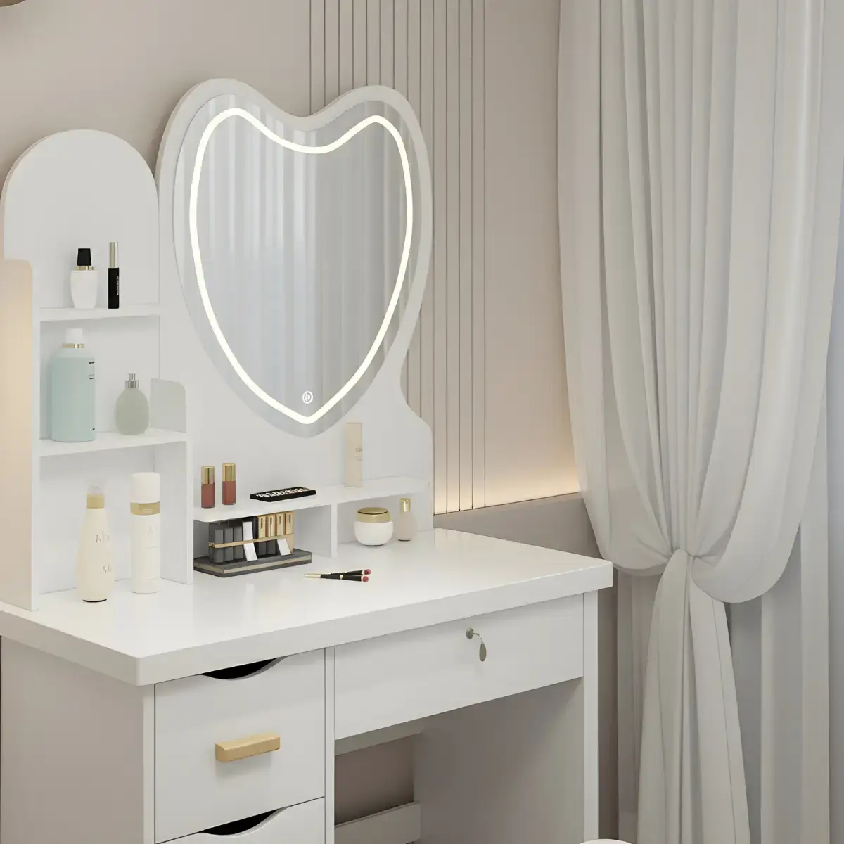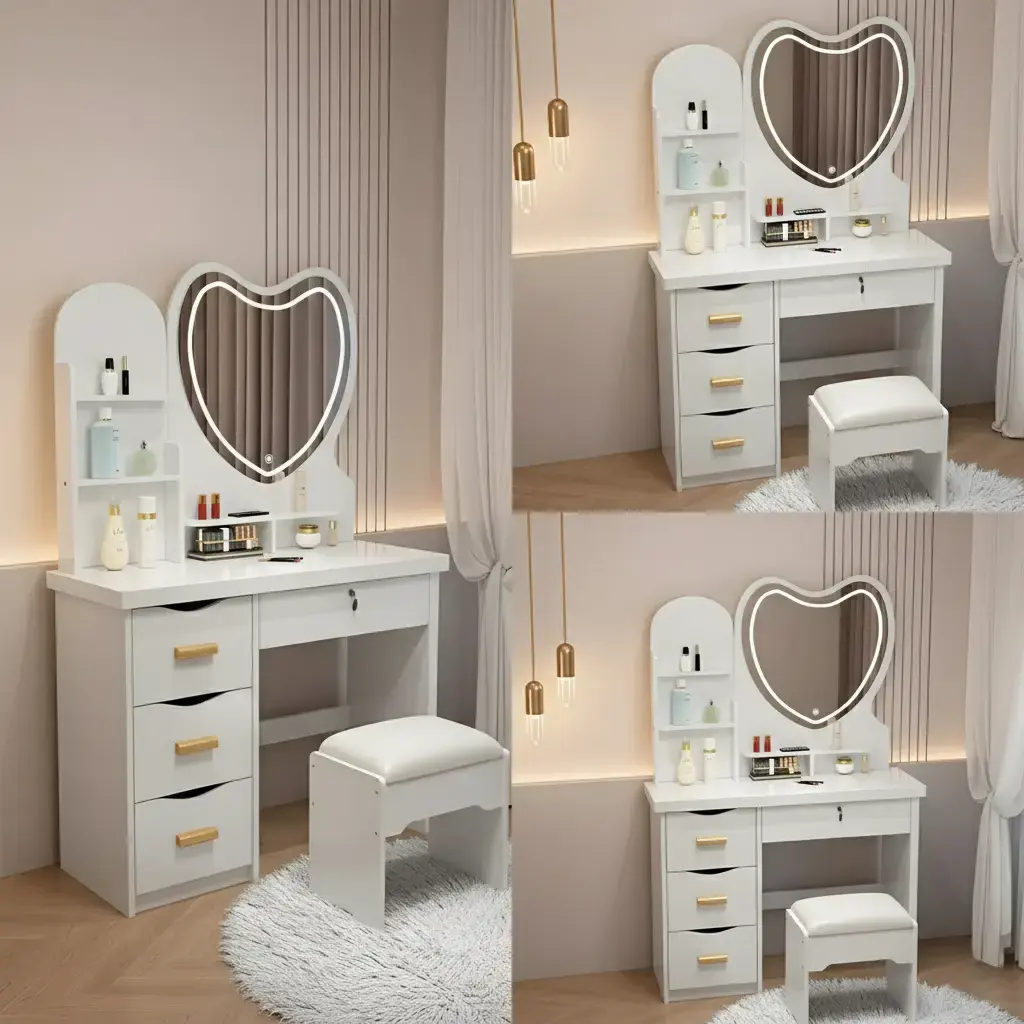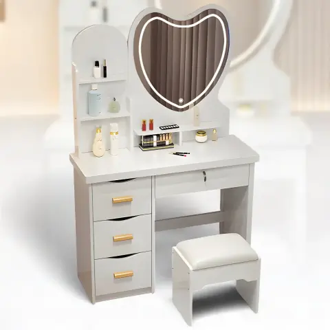 Стіл макіяж з LED дзеркалом у формі серця та пуфиком – це функціональний комплект для зручного повсякденного догляду. Широка стільниця, зручні полиці та висувні ящики дозволяють розмістити всю косметику, доглядові засоби та аксесуари, зберігаючи порядок та комфорт. LED-підсвічування за контуром дзеркала забезпечує рівномірне освітлення, роблячи процес макіяжу точним та приємним.