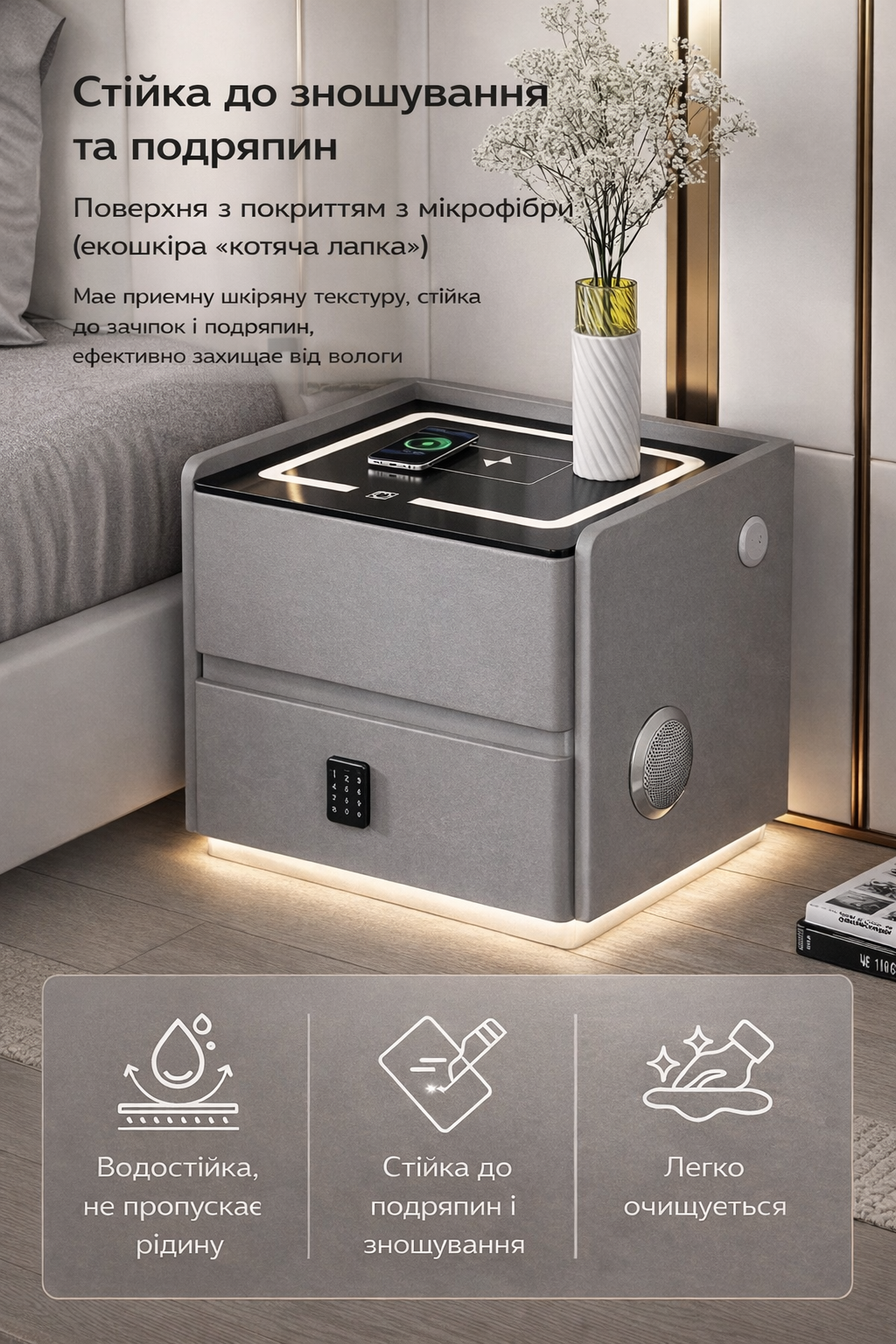 Сучасна багатофункціональна тумба - це не просто меблі, а повноцінний технологічний центр комфорту у вашій спальні.Елегантне оздоблення з екошкіри надає інтер'єру преміального вигляду, а вбудоване LED-підсвічування створює м'яку атмосферу затишку у вечірній час.