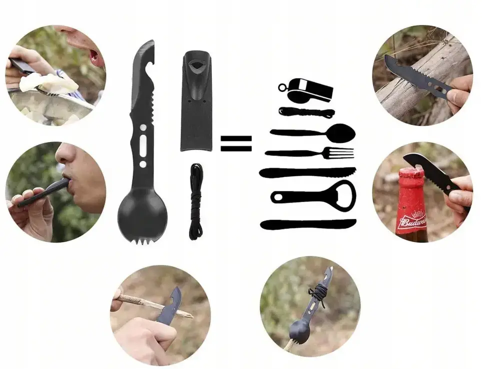 предмети першої необхідності - ложка з ножем та відкривала для пляшок + пластикова кришка/свисток