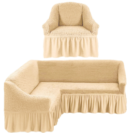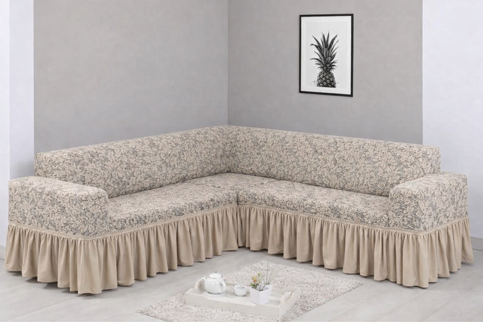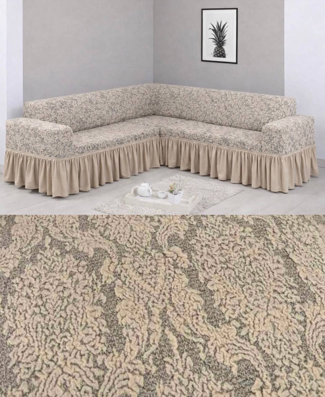 Кутовий жаккардовий чохол на диван, натяжний чохол універсальний, накидка на диван Бежевий
