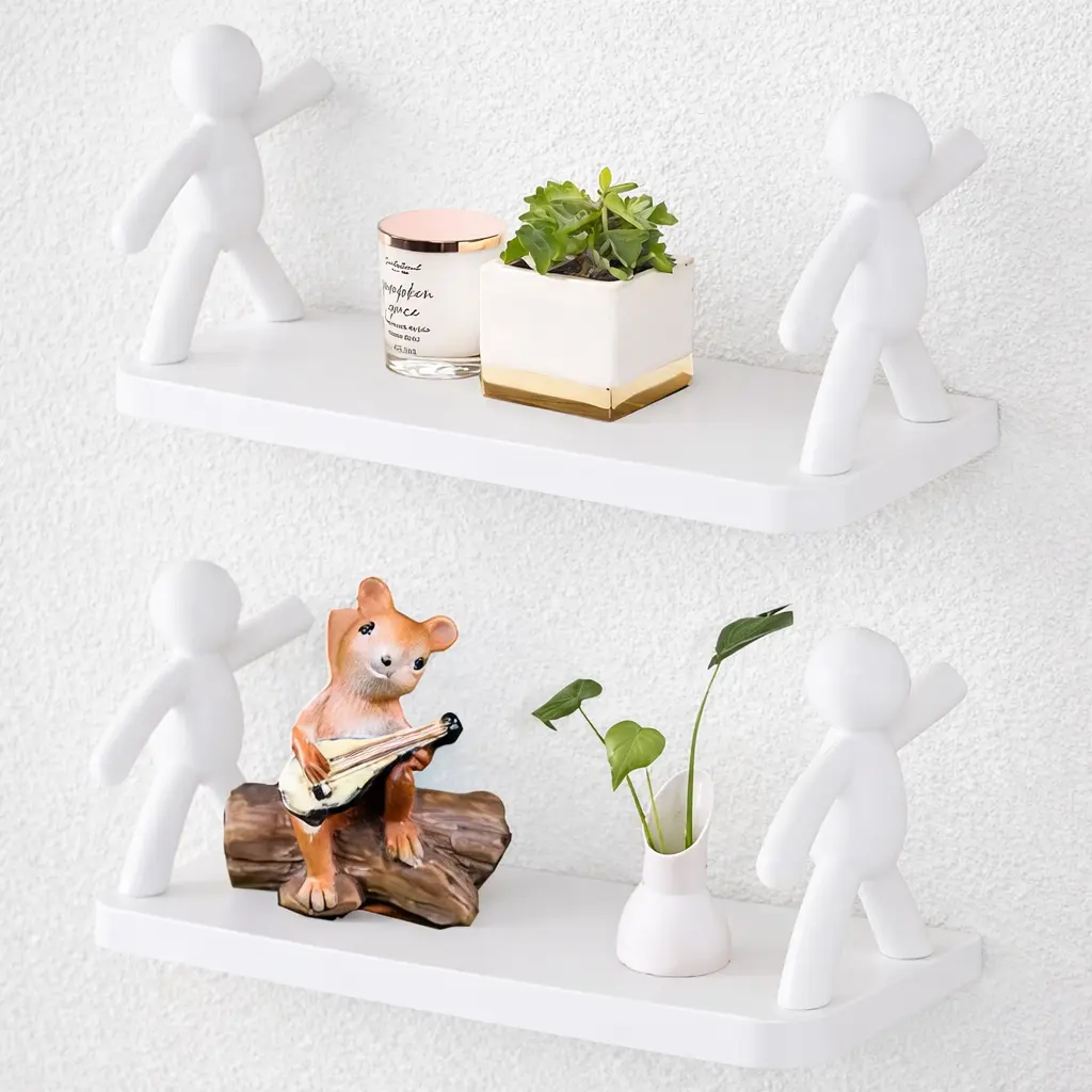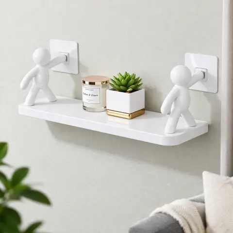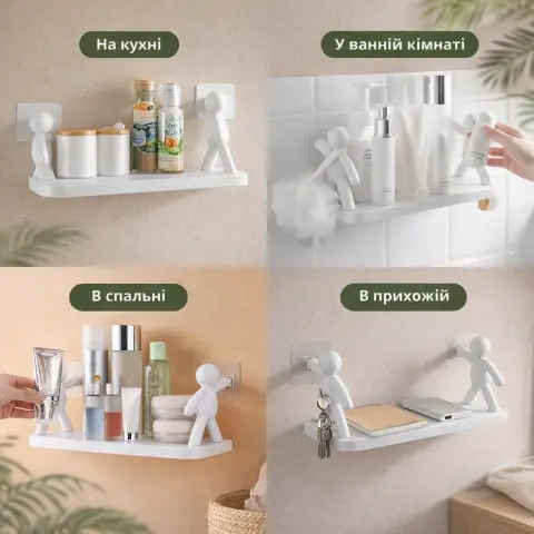 Полиця з чоловічками – це простий та сучасний дизайн. Полиця на липучках може служити для зберігання різних предметів таких як мило, мильниця, диспенсер для мила, бритви, зубні щітки, зубні пасти, крем для обличчя, крем для рук, лосьйон після гоління, гель для гоління, гель для душу, шампунь, освіжувач повітря на туалетний папір, туалетний папір, туалетний папір такі як мочалки, гумки для волосся, біжутерію, браслети, ланцюжок, годинник, навушники та багато іншого.