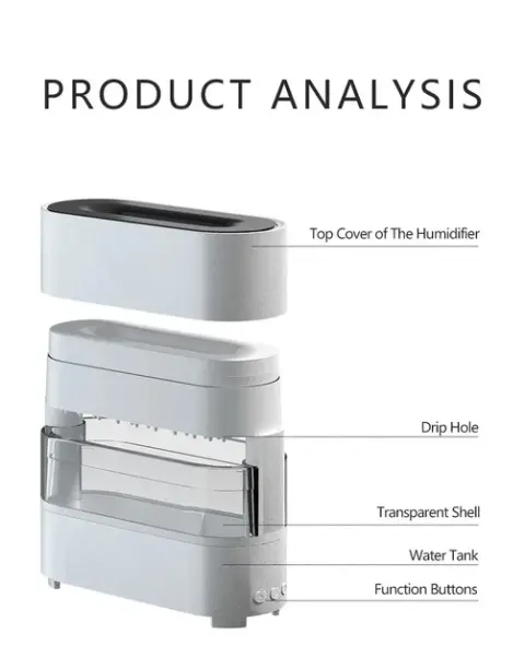 Білий шум сприяє швидкому засинанню, а додавання ефірних олій допоможе створити приємну ароматерапевтичну атмосферу. Полум'я може змінювати кольори (білий, червоний, жовтий, зелений, блакитний, синій, фіолетовий та кольоровий) та створює розслаблюючу обстановку. Управління просто, за допомогою кнопок можна регулювати режими розпилення, освітлення та крапель дощу.