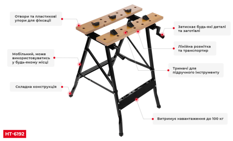 Стільниця верстата виступає в ролі лещат і може використовуватися для фіксації різних за розмірами деталей. Завдяки двом зручним ручкам лещата можна відкрити та зафіксувати необхідний предмет шириною до 27 см.
