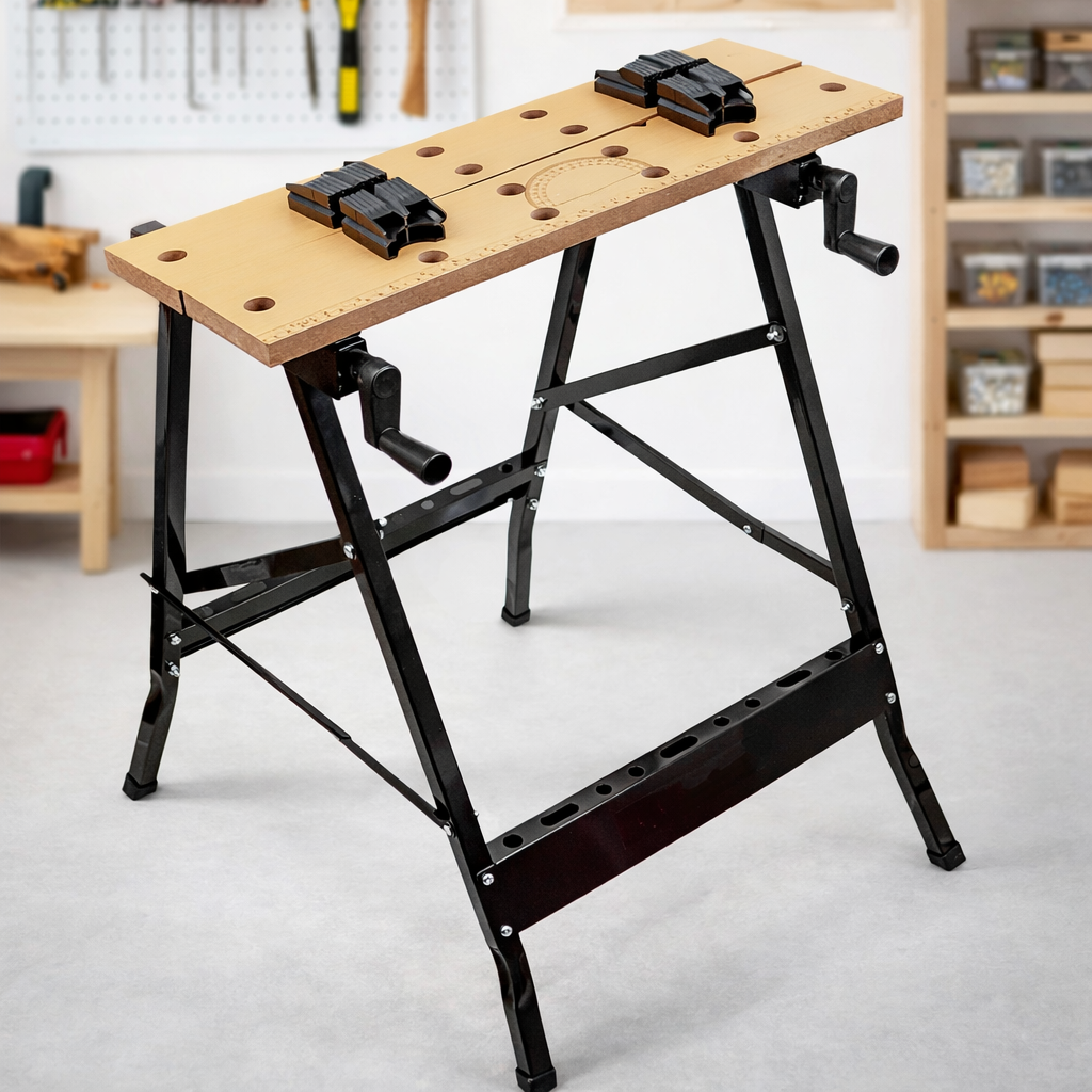Складаний верстат застосовується для виконання різних робіт, для затискання деталей та заготовок, та їх подальшої обробки. Завдяки своїй складній конструкції, він може транспортуватися та використовуватись у будь-якому місці, на виїзді, без прив'язки до робочого простору. Також не займає багато місця для зберігання.