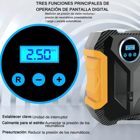 Насос оснащений цифровим РК-дисплеєм з підсвічуванням. Він дозволяє точно контролювати необхідний тиск у 4 режимах (PSI, бар, кПа та кг/см²). Після підключення до шини, що накачується, вам потрібно тільки встановити необхідний тиск (PSI). Коли буде досягнуто необхідного тиску (PSI), електричний автомобільний насос для накачування шин автоматично вимкнеться, тому вам не потрібно турбуватися про перекачування шин.