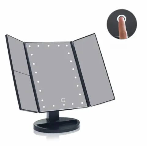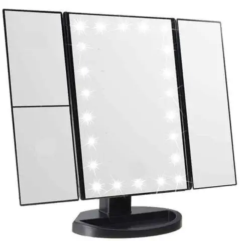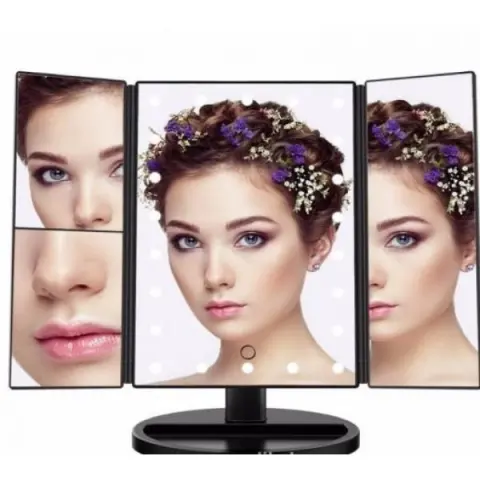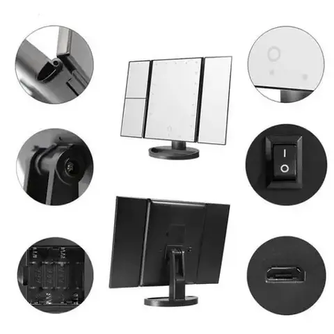 Дзеркало для макіяжу має три відбивні сторони, і одна з них має властивості лінзи. Збільшення лінз двох- і триразове, що допоможе вам ретельно розглянути будь-яку частину особи. Також дзеркало оснащене сенсорною кнопкою включення та вимикання, яка заощадить заряд батарейок.